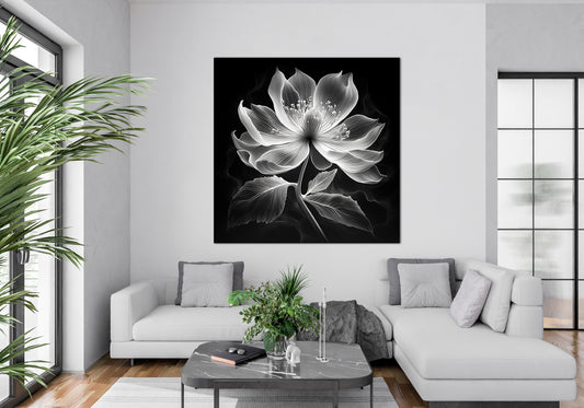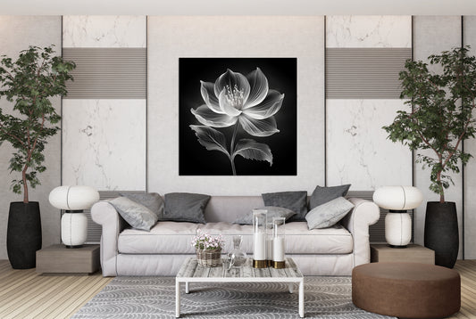 Xray Jasmine II is an ethereal floral study featuring a luminous bloom rendered in fine white lines on a deep black background. Subtle highlights of warm peach glow from the center, suggesting life force or inner light. The technique is reminiscent of digital x-ray art or botanical engraving, emphasizing translucence...