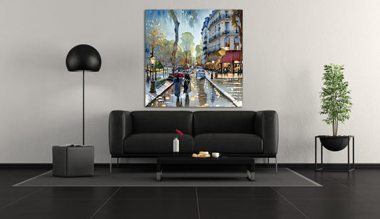 Bordeaux Morning is an urban street scene captured in a loose, flowing watercolor style, depicting figures strolling through a Parisian boulevard. Trees and architecture melt into each other in soft autumn tones, and glints of light reflect in the puddles from recent rain. The atmospheric layering and expressive linework suggest...
