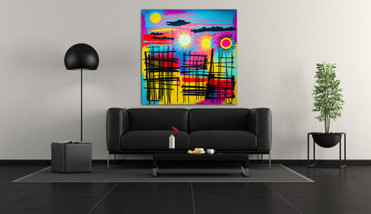 Brighter Days Ahead II is a vibrant and bold abstract piece using thick strokes of color—turquoise, yellow, pink, and red—intersected by black grid-like forms. The sky features three stylized suns or celestial bodies, adding a surreal cosmic dimension. This highly graphic and energetic composition feels rooted in neo-pop abstraction, with...