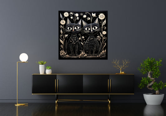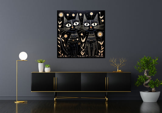 Cat Night, In this charming, folk-art-inspired piece, depicts two stylized black cats surrounded by golden flowers against a deep black background. The exaggerated eyes and symmetrical posture create a sense of innocence and wonder, while the limited palette and illustrative lines give the work a refined graphic clarity. The style...