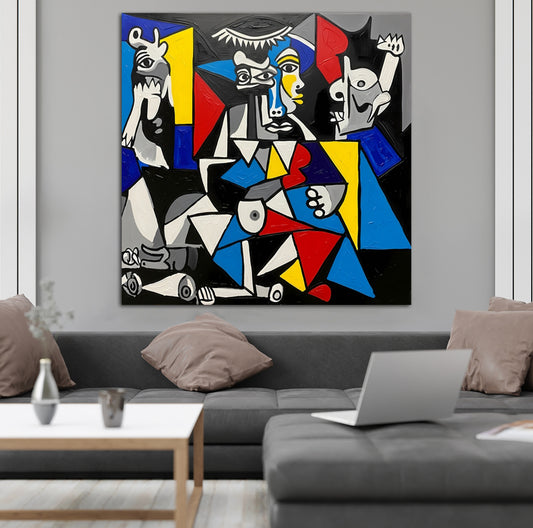 "Calculated Tangle" draws from the cubist and neo-expressionist lineage, depicting angular figures in an intense scene with exaggerated features and fragmented anatomy. Faces are skewed and limbs geometric, composed with blocks of bright primary colors and heavy black lines. The central figure dominates, surrounded by other ambiguous characters, creating a...