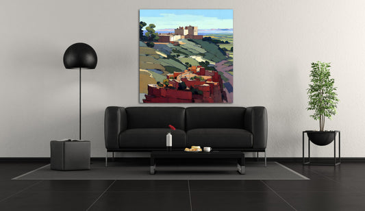 Castle Hill is a stylized landscape that presents terraced hills and ancient fortress-like buildings rendered in flat, richly colored planes. The technique is graphic yet painterly, with an emphasis on architectural form and landscape design. The perspective is elevated and panoramic, giving a sense of sweeping grandeur. Genre-wise, this lies...