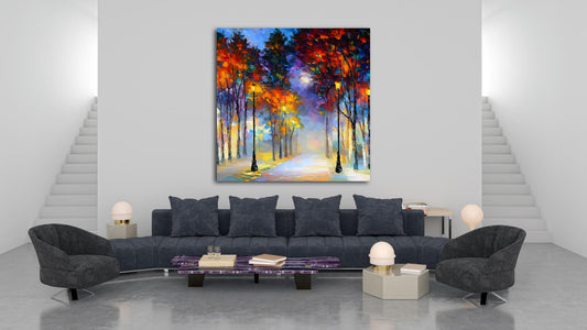 Evening Park Lights is a radiant impressionist street scene bathed in the glow of lamplight. Tall trees with vivid autumn foliage in red, orange, and yellow frame a dreamy pathway that disappears into a soft mist. The heavy texture and bold palette knife technique infuse the piece with emotional warmth...