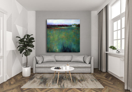 Field of Dreams I is a serene, ethereal landscape painted in soft, atmospheric tones. The blurred horizon, violet haze, and distant barn suggest a dreamlike countryside. The abstract brushstrokes create a gentle, meditative field of green, making this a quintessential example of abstract impressionism. The work uses subtle gradients and...
