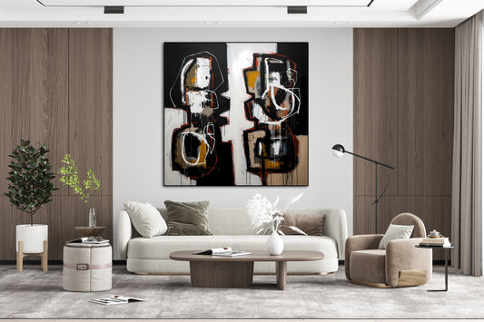 Echoes in Contrast is an emotionally resonant work featuring two large forms—resembling human figures—facing each other in silhouette across a stark vertical division. White, ochre, and brown strokes swirl around their forms, while drips and rough outlines emphasize volatility. The piece explores duality and internal conflict, and is best categorized...