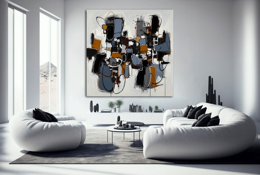 Echoes in Umber where dark ochre, burnt sienna, black, and grey dominate this textured abstract landscape. The canvas is filled with angular sections that resemble fractured buildings or machinery. Its rough brushwork and tonal depth suggest an urban abstraction, offering a moody, somber reflection on entropy and change. The genre...