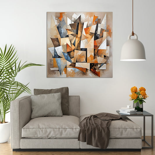 Angular Motion is a masterclass in geometric Ulysseion, this work is a dynamic tapestry of overlapping shards and planes rendered in a warm, earthy palette of ochres, grays, creams, and rust tones. The composition is non-representational yet evokes a sense of controlled chaos, where sharp angles and layered forms suggest...