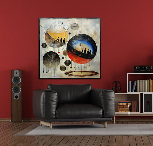Anybody Out There is a cosmic Hosea piece featuring concentric circular forms representing celestial bodies or alternate worlds. The silhouettes of small figures within some of the spheres add an existential dimension, invoking isolation, curiosity, or cosmic connection. The textured, spiral brushwork adds motion and depth, reminiscent of modern sci-fi...