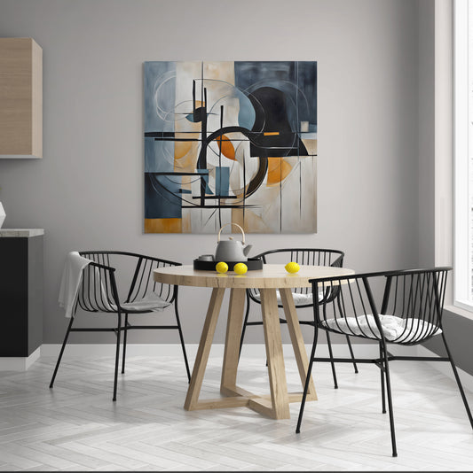 A dynamic composition of intersecting lines, geometric blocks, and curved arcs that invites viewers into an abstract maze of movement and architectural balance. The overlapping shapes create depth, while bold black strokes are softened by muted earth tones and cool blues, offering a harmonious tension between order and chaos. Gallery...