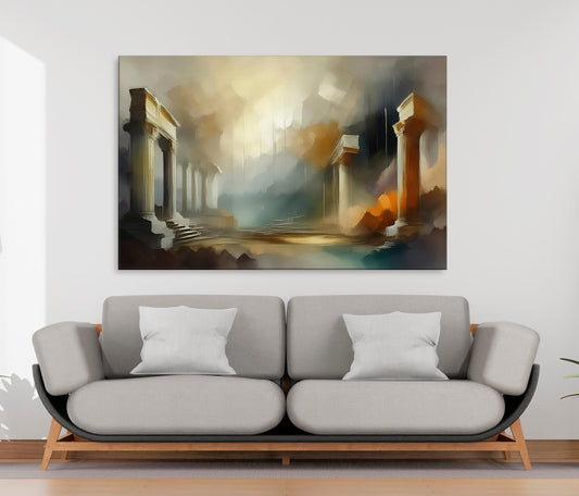 This dramatic piece showcases a decaying yet majestic set of Roman columns under golden light. The steps and shadows provide a sense of scale and depth, while the sweeping brushstrokes give the ruins a ghostly presence. A foggy, timeless background blurs the line between sky and stone. The atmosphere suggests...