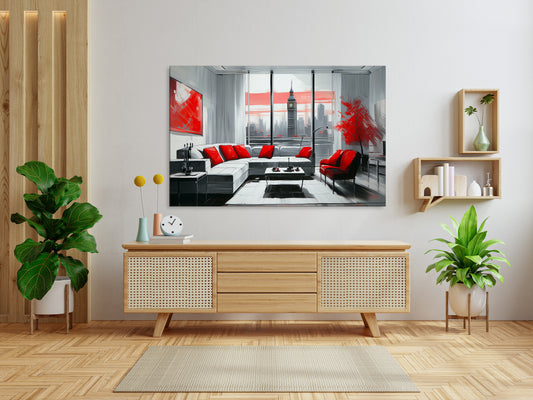 This contemporary interior scene offers a high-rise view of Big Ben, juxtaposed against a starkly modern apartment setting. The bold use of red,seen in cushions, artwork, and trees,creates visual impact against a sleek white and gray backdrop. The angular lines and clean composition suggest urban luxury and design precision. Big...