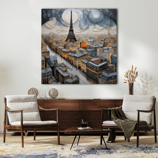 Eiffel's Towering City presents a fantastical Paris from above, built with geometric rooftops and spiral clouds surrounding the Eiffel Tower. The style combines a textural, digital-like aestheti c with structured abstraction, evoking a fusion of steampunk and stylized cityscape. Enhance your décor today and bring this unique artwork into your...