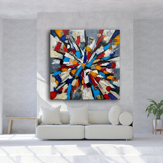 Energetic Construct is a vibrant piece that erupts with kinetic motion, evoking the spirit of Jackson Pollock through its layered splashes and drips of red, yellow, black, white, and blue. The swirling density of marks within a darkened border creates a vortex of intensity, visually encapsulating chaos and structure in...