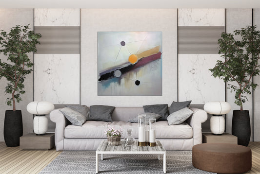 Solar Sequence is a geometric abstract that plays with balance and proportion, that features a sequence of circles connected by fine linear threads over a diagonal palette of warm ochre, burgundy, and slate. The visual rhythm suggests celestial mechanics or molecular structures. With its subdued tones and deliberate composition, the...