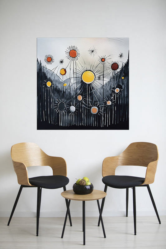 Stellar Pulse depicts radiating circular suns or starbursts lighting up a charcoal-toned mountain valley, connected by fine lines that resemble energy pulses or constellations. The central yellow sphere feels alive—perhaps symbolizing vitality or celestial rhythm. The style blends abstract expressionism with cosmic surrealism, evoking interconnectedness, light, and energy. Enhance your...