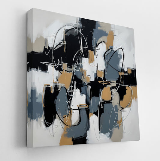 Urban Cadence is a sophisticated composition that reads like a map of intersecting structures and pathways, created with a palette of beige, slate, black, and ivory. Its crosshatched and overlapping forms evoke an aerial view of an abstracted city grid. The expressive white linework winds like tangled data or electrical...