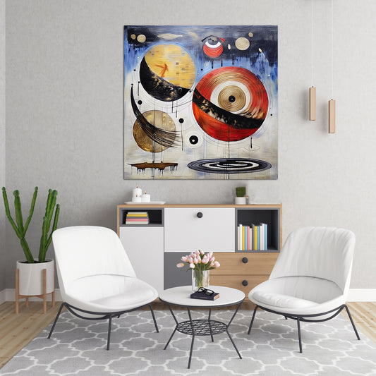 Spheres in Structure is a cosmically charged composition that blends symbolism and abstraction. Bold, circular forms in gold, red, and cream are layered with texture and detail—some resembling planetary systems, others like vinyl records or mythic symbols. The technique is dense with layered brushwork and dripping lines. Its genre is...