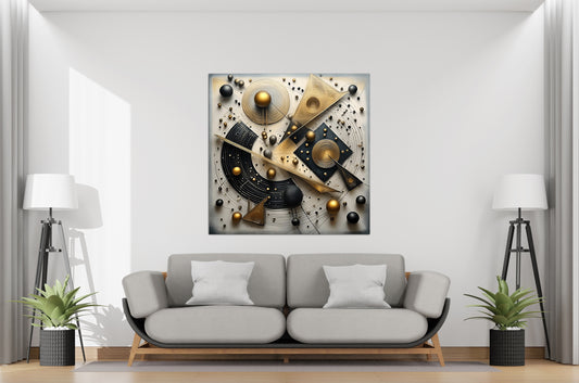 The Geometry of Space is a visually complex composition presenting a cosmic arrangement of golden spheres, triangles, arcs, and swirling lines. Set against a neutral background, the 3D elements appear to float and orbit in celestial harmony. The piece draws from modernist abstraction and mathematical design, blending futurism with precision....