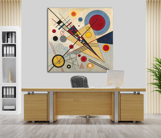 Cosmic Grid, heavily inspired by Constructivism and Bauhaus aesthetics, arranges crisp geometric shapes—circles, lines, and triangles—into a harmonious yet dynamic system. Its vivid primary colors and sense of celestial orchestration evoke universal order and scientific design. The genre is geometric abstraction, with technical precision and conceptual elegance. Enhance your décor...