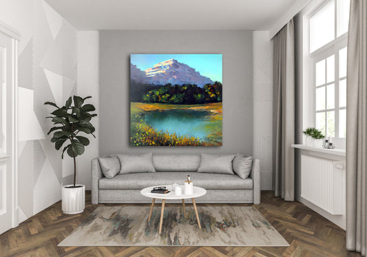 Foot Of the Mountains is a peaceful mountain scene where light and reflection take center stage. A quiet lake mirrors the surrounding forest and distant lavender-tinted peaks. The brushwork is loose yet defined, offering a realistic structure softened by impressionist lighting. This painting exudes natural harmony, bridging realism and impressionism....