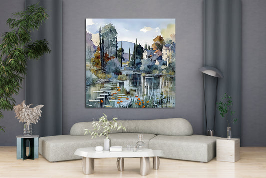 Riverfront Living is a serene and elegant watercolor-style depiction of a village lining a reflective riverbank. Soft washes of pastel colors, delicate lines, and subtle shading evoke tranquility and harmony. The architectural elements are simplified but maintain clarity, reinforcing the quiet charm of countryside living. Genre: watercolor landscape; Style: modern...