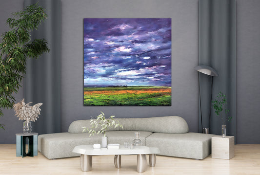 Storm Clouds Moving In showcases a dramatic skyscape featuring layered clouds in purples, blues, and pinks moving swiftly over a green and gold field. Painted with palette knife textures and expressive energy, the piece conveys nature’s power and the tension before a storm. The low horizon intensifies the emotional weight...