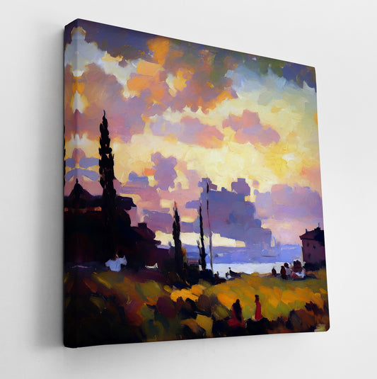 Watching the Sunset, set in a golden field overlooking water, this tranquil piece glows with the warmth of late evening light. Silhouetted figures and cypress trees stretch across the landscape, softened by diffused brushwork. The artist masterfully captures the emotional hush of sunset, with a cloud-filled sky that blends lavender,...