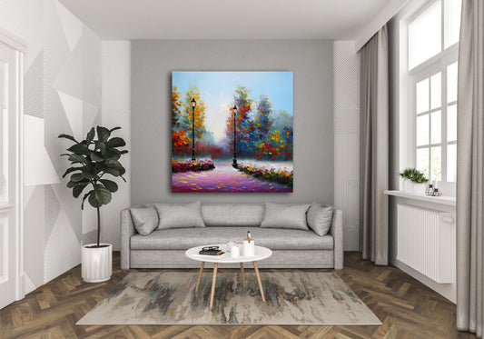 Sunflower Fields in Provence is a vibrant landscape glows with color and pastoral charm. A sweeping field of sunflowers stretches toward a glowing horizon, where light dances across a cloudy sky. The painterly brushstrokes—loose and expressive—imbue the scene with motion and warmth. This piece belongs to the lyrical landscape tradition,...