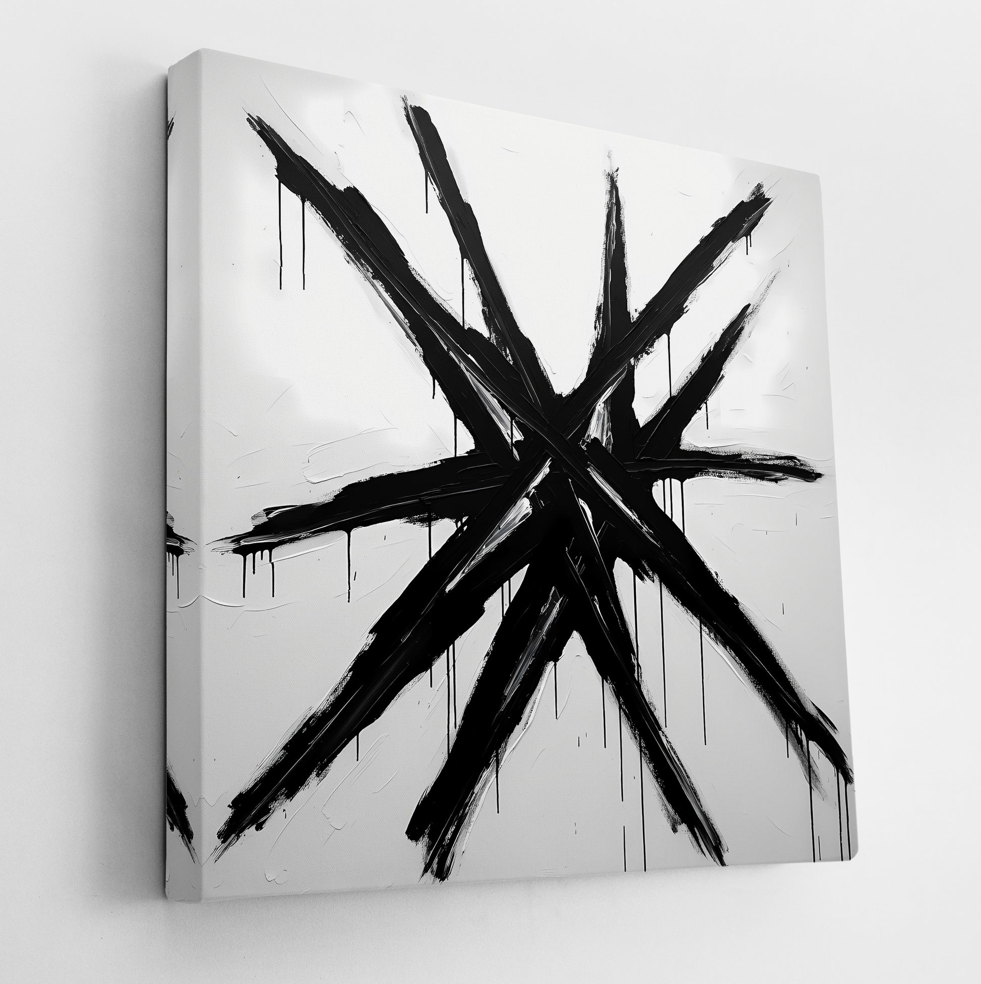 Blackburst is a raw, minimalist abstract painting featuring a violent explosion of black brushstrokes that radiate from the center in jagged, star-like formation. The strokes drip downward, echoing emotional intensity and gestural urgency. This monochromatic composition is evocative of post-war abstract expressionism and action painting. Executed in thick black acrylic or oil on white canvas, the technique uses impasto and drip to convey primal release. The genre is minimalist expressionism or abstract gesture, referencing inner turmoil or explosive force through pure form. Enhance your décor today and bring this unique artwork into your home or office. This beautiful gallery wrapped canvas is the perfect addition to your favorite home or office space. This Original artwork is available only on Wayfair and comes in a variety of sizes allowing you to find what works best within your home or office. Each piece is printed on museum-grade canvas designed to stand the test of time. Durability, image clarity, and color accuracy are our top priorities, as we use archival inks to prevent fading and to preserve as much fine detail as possible with no over-saturation or color shifting. Our professional staff produce the tightest corners without any bubbles, ripples, or bumps, and include pre-installed hanging hardware for easy installation.