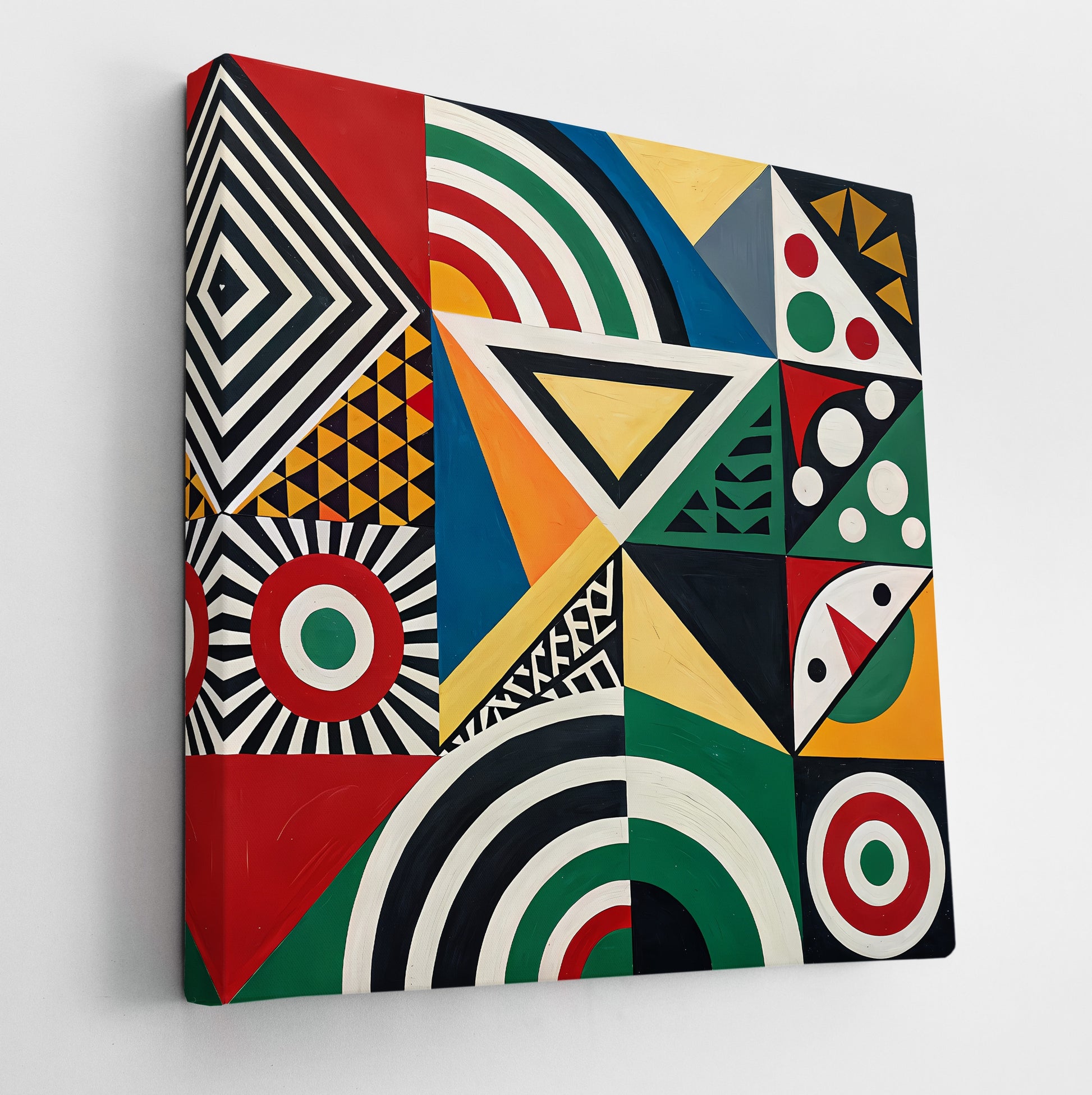 Fragments of Order is a geometric mosaic that divides the canvas into a variety of contrasting triangles, circles, and trapezoids arranged in clean grids. The bold color blocking and flat design recall Bauhaus modernism and mid-century abstraction. Using hard-edge painting technique, it thrives on visual balance and symbolic patterning, reflecting a structured interpretation of rhythm and logic. Enhance your décor today and bring this unique artwork into your home or office. This beautiful gallery wrapped canvas is the perfect addition to your favorite home or office space. This Original artwork is available only on Wayfair and comes in a variety of sizes allowing you to find what works best within your home or office. Each piece is printed on museum-grade canvas designed to stand the test of time. Durability, image clarity, and color accuracy are our top priorities, as we use archival inks to prevent fading and to preserve as much fine detail as possible with no over-saturation or color shifting. Our professional staff produce the tightest corners without any bubbles, ripples, or bumps, and include pre-installed hanging hardware for easy installation.