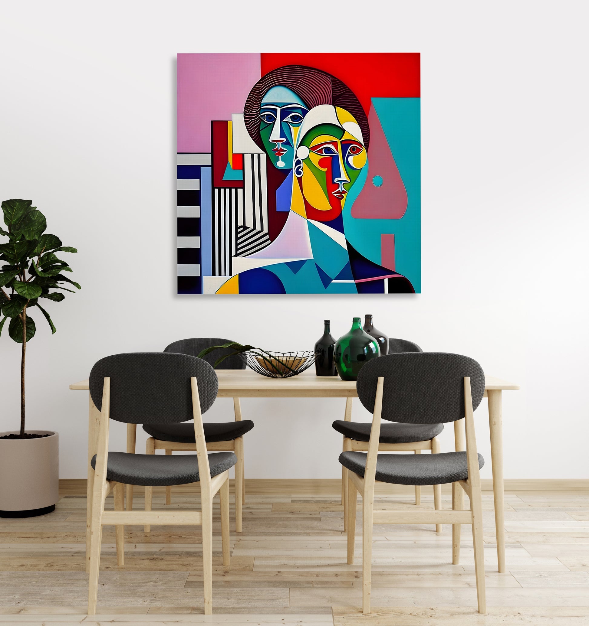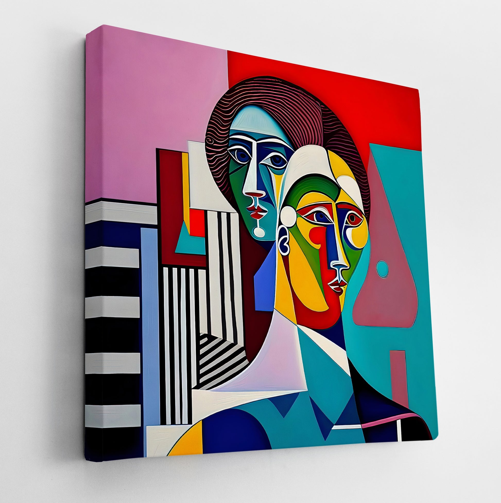 Looking For Common Ground is a stylized dual portrait showcasing a cubist approach with sharp-edged shapes and vivid color blocks. Two figures merge through angular geometry, their expressions softened by harmonious palettes. It belongs to the neo-cubist genre, drawing from Picasso and Léger, with a touch of pop-art vibrancy and contemporary graphic precision. Enhance your décor today and bring this unique artwork into your home or office. This beautiful gallery wrapped canvas is the perfect addition to your favorite home or office space. This Original artwork is available only on Wayfair and comes in a variety of sizes allowing you to find what works best within your home or office. Each piece is printed on museum-grade canvas designed to stand the test of time. Durability, image clarity, and color accuracy are our top priorities, as we use archival inks to prevent fading and to preserve as much fine detail as possible with no over-saturation or color shifting. Our professional staff produce the tightest corners without any bubbles, ripples, or bumps, and include pre-installed hanging hardware for easy installation.