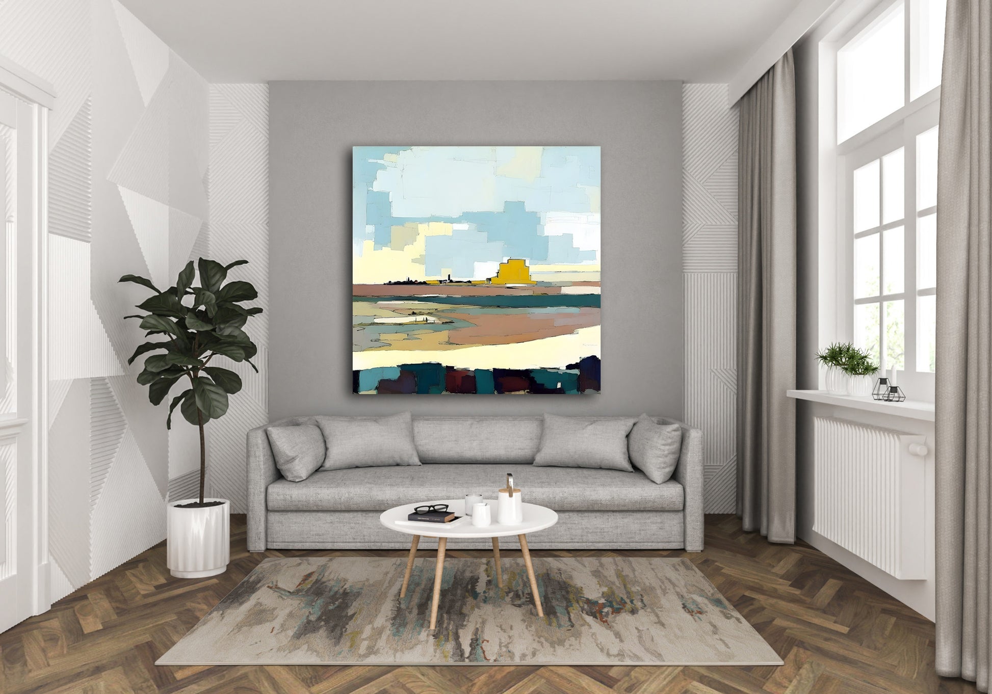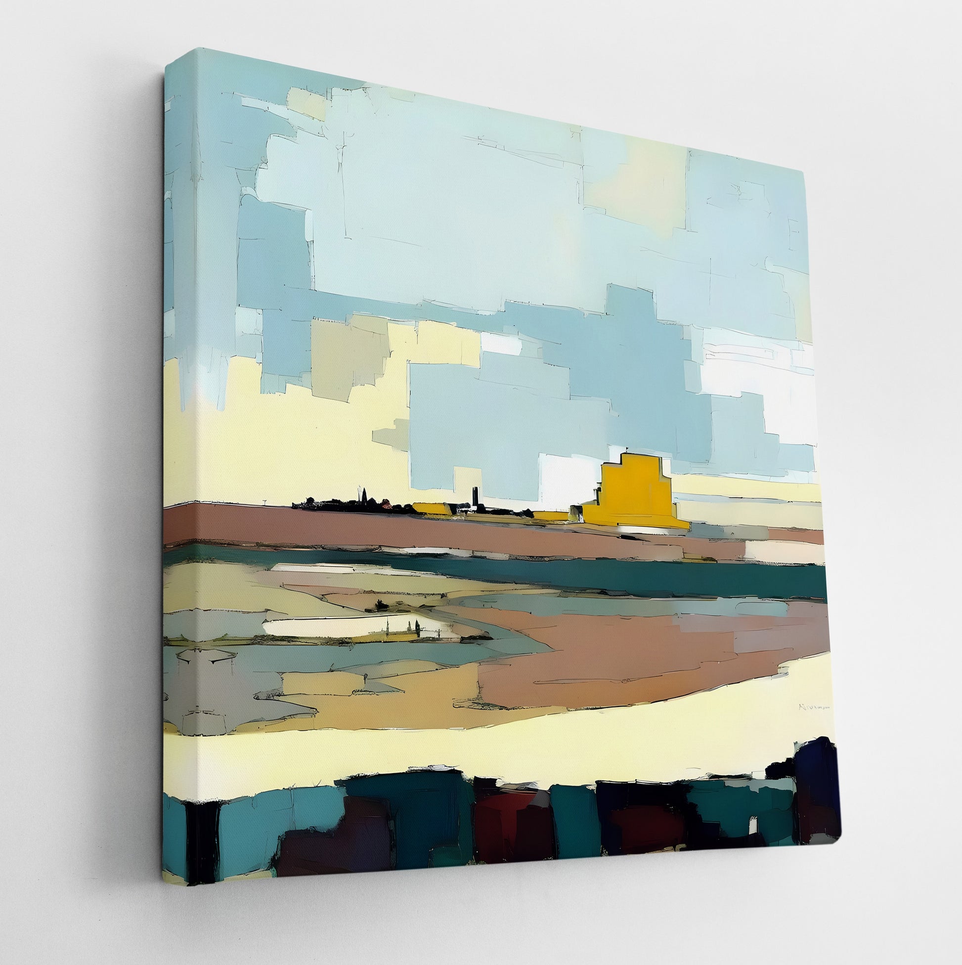 Morning Sunshine is a semi-abstract composition that reduces the landscape to geometric segments of sky, land, and architecture. Blocks of muted blues, ochres, and soft browns layer horizontally, punctuated by sharp vertical silhouettes that suggest distant structures. The painterly yet controlled application and minimal detail reflect a modernist abstraction, likely influenced by Cubism and Color Field painting, positioning this work in the realm of abstract landscape with urban overtones. Enhance your décor today and bring this unique artwork into your home or office. This beautiful gallery wrapped canvas is the perfect addition to your favorite home or office space. This Original artwork is available only on Wayfair and comes in a variety of sizes allowing you to find what works best within your home or office. Each piece is printed on museum-grade canvas designed to stand the test of time. Durability, image clarity, and color accuracy are our top priorities, as we use archival inks to prevent fading and to preserve as much fine detail as possible with no over-saturation or color shifting. Our professional staff produce the tightest corners without any bubbles, ripples, or bumps, and include pre-installed hanging hardware for easy installation.