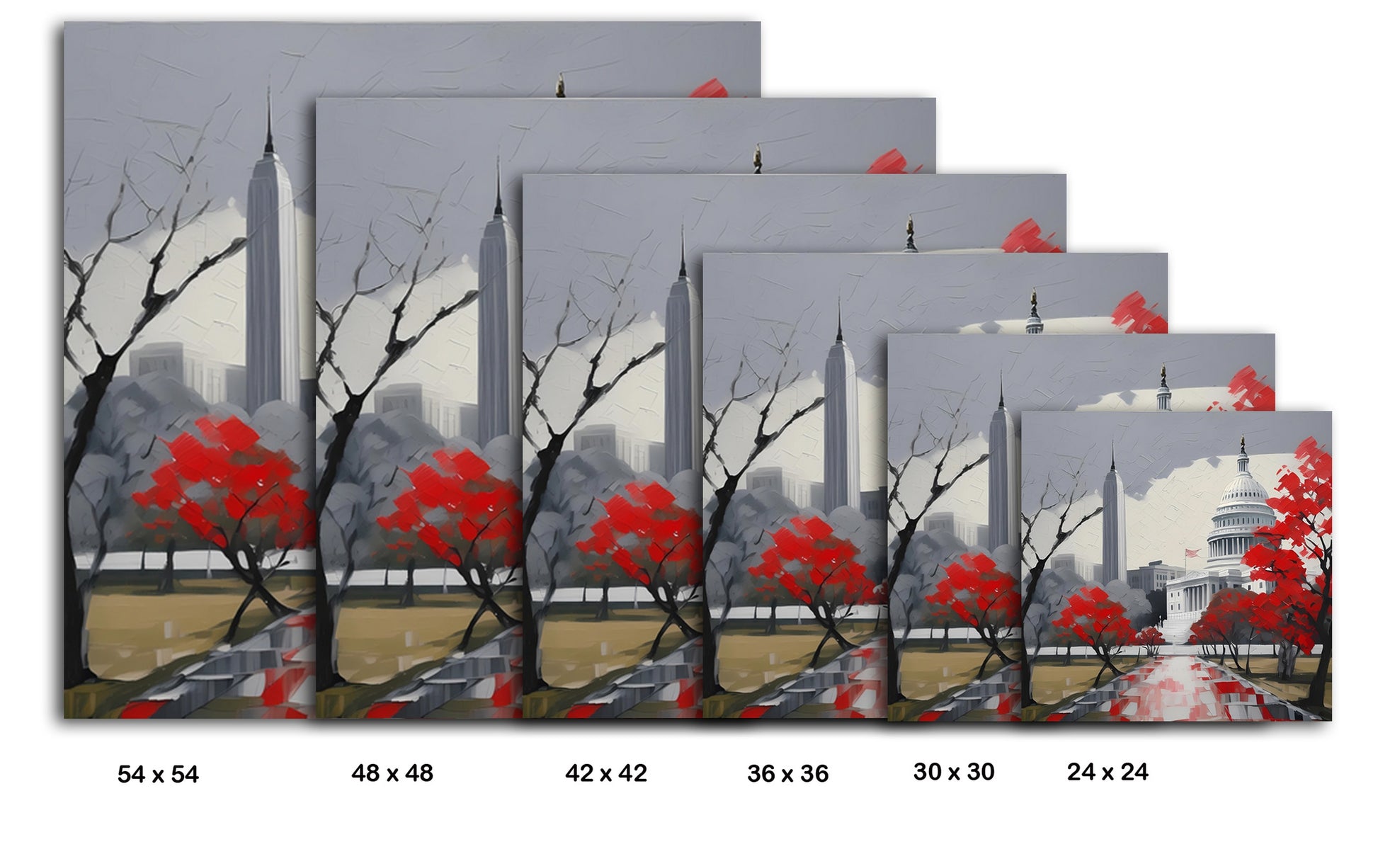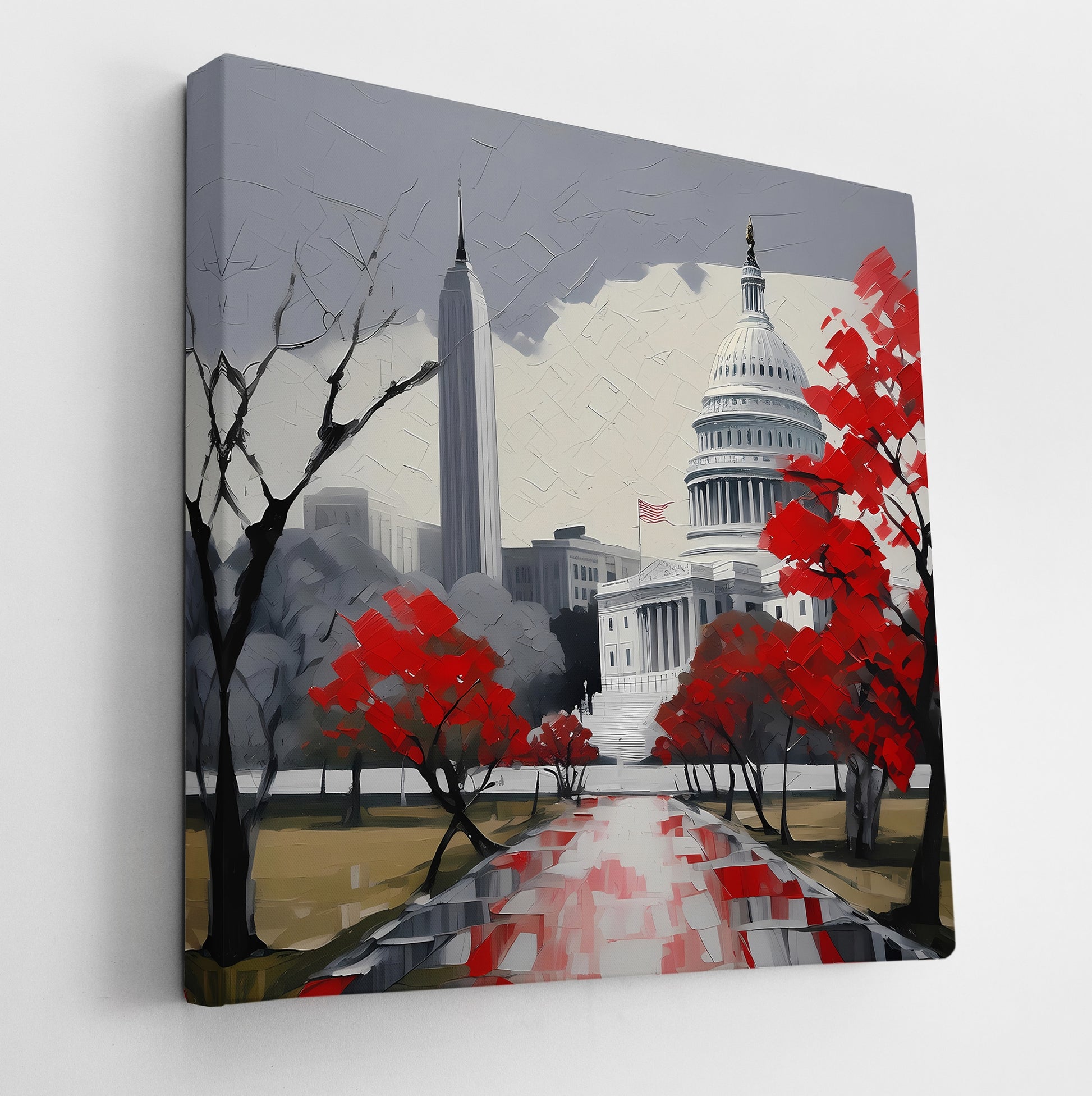 Road to the Capital is a stylized cityscape that presents a striking perspective of Washington, D.C., lined with red-leaved trees and centered on the Capitol dome. The composition is highly graphic, almost poster-like, with clean lines, bold contrasts, and expressive knife-stroke textures. It’s a contemporary take on realism with illustrative flair—idealized, symbolic, and dignified, capturing the patriotic spirit through its controlled palette and compositional balance. Enhance your décor today and bring this unique artwork into your home or office. This beautiful gallery wrapped canvas is the perfect addition to your favorite home or office space. This Original artwork is available only on Wayfair and comes in a variety of sizes allowing you to find what works best within your home or office. Each piece is printed on museum-grade canvas designed to stand the test of time. Durability, image clarity, and color accuracy are our top priorities, as we use archival inks to prevent fading and to preserve as much fine detail as possible with no over-saturation or color shifting. Our professional staff produce the tightest corners without any bubbles, ripples, or bumps, and include pre-installed hanging hardware for easy installation.