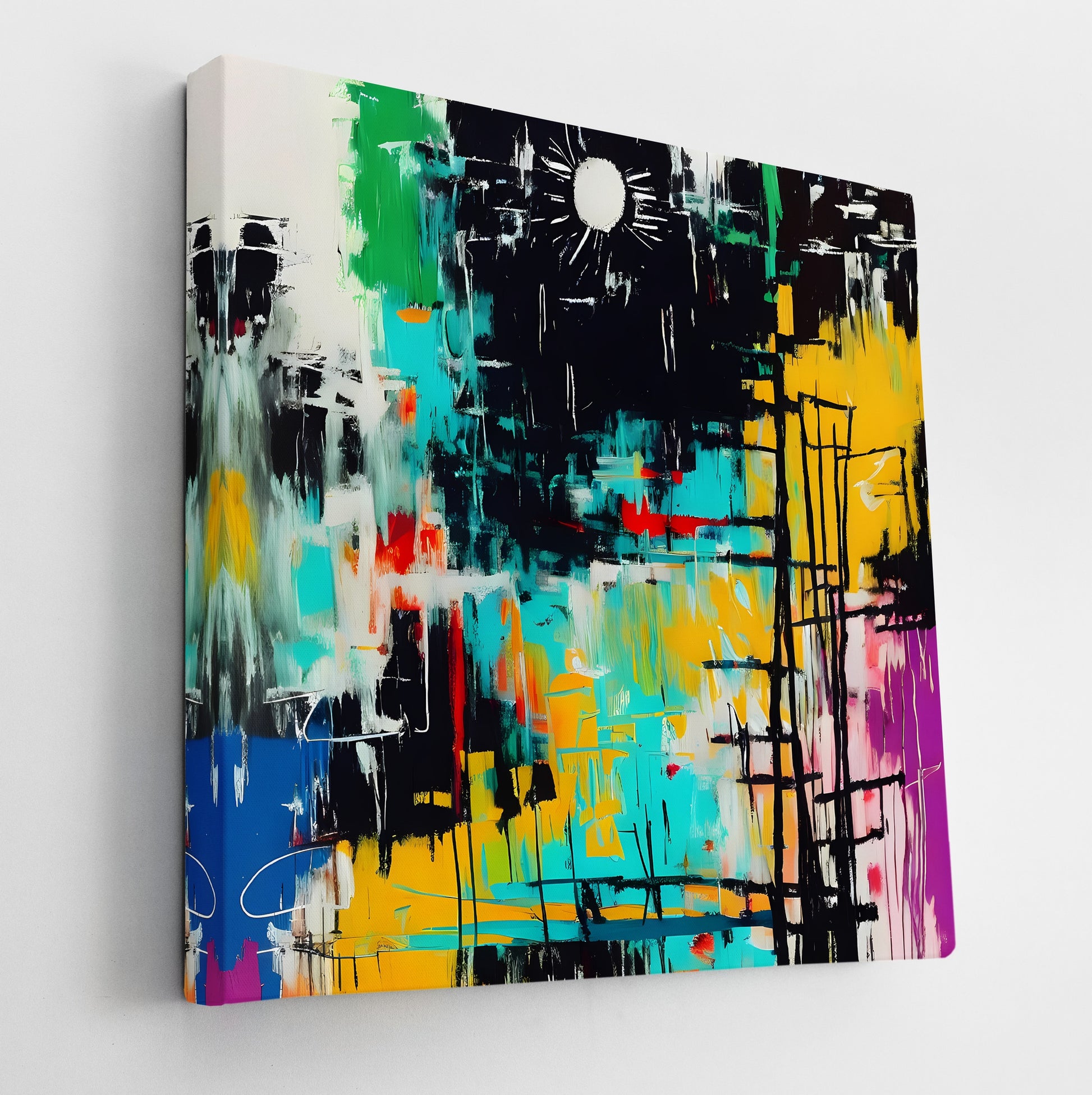 Sun Up is a vibrant abstract composition bursting with color and kinetic energy. Broad strokes of turquoise, yellow, red, and black dance across the surface, with a symbolic white sun breaking through a midnight sky. The layering of color and texture captures emotional intensity, possibly symbolizing renewal or awakening. Enhance your décor today and bring this unique artwork into your home or office. This beautiful gallery wrapped canvas is the perfect addition to your favorite home or office space. This Original artwork is available only on Wayfair and comes in a variety of sizes allowing you to find what works best within your home or office. Each piece is printed on museum-grade canvas designed to stand the test of time. Durability, image clarity, and color accuracy are our top priorities, as we use archival inks to prevent fading and to preserve as much fine detail as possible with no over-saturation or color shifting. Our professional staff produce the tightest corners without any bubbles, ripples, or bumps, and include pre-installed hanging hardware for easy installation.