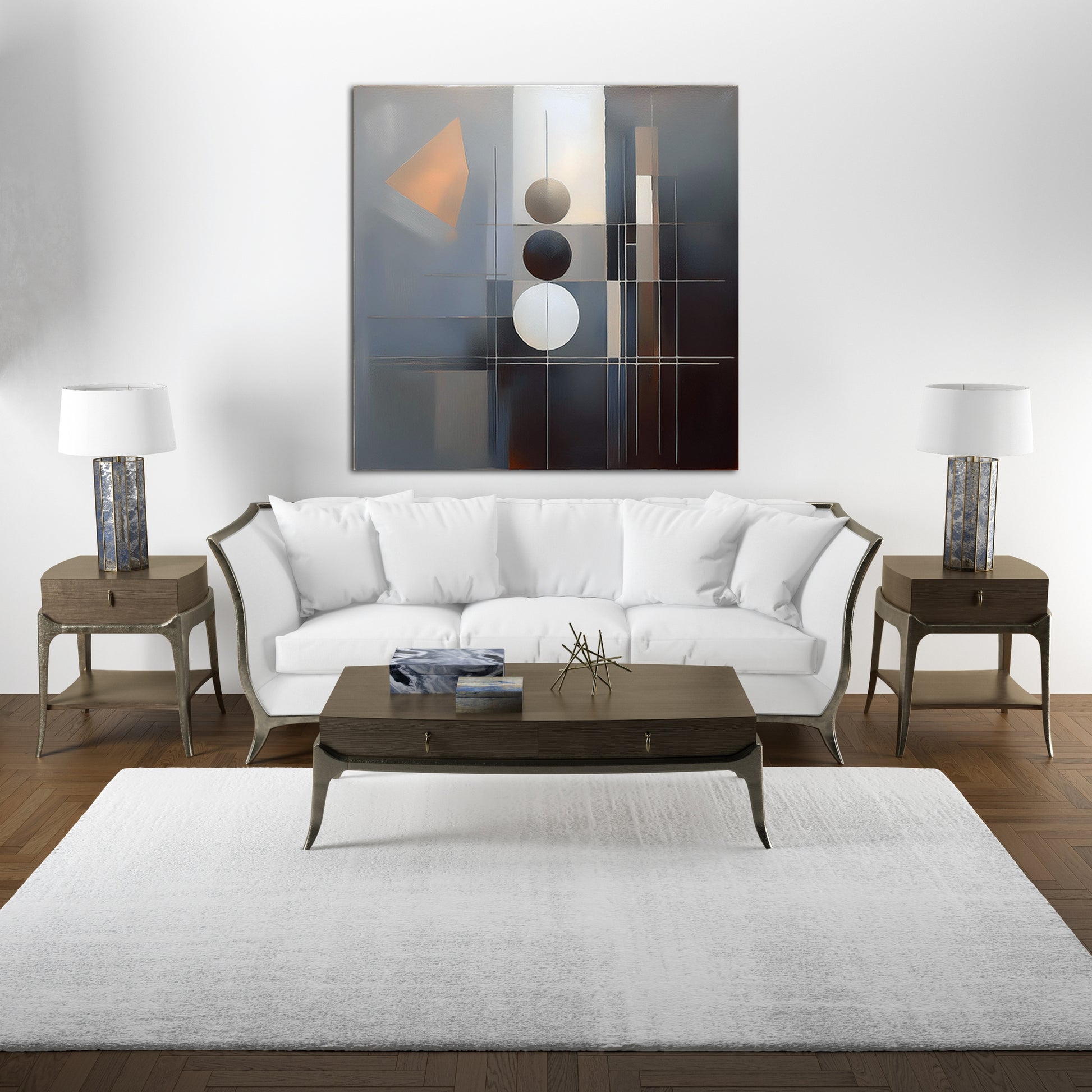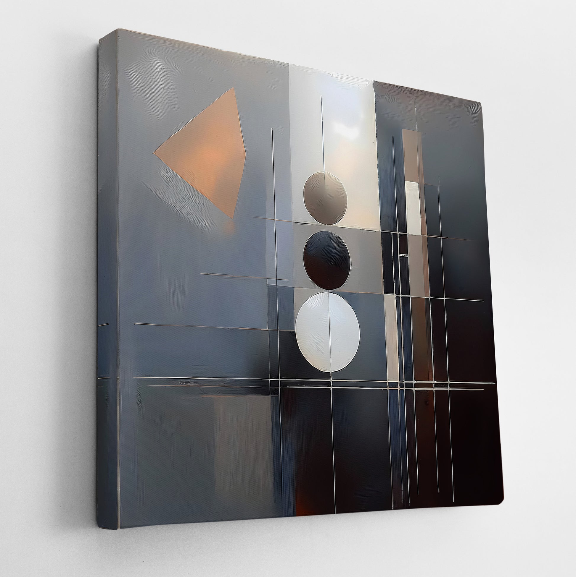 Symmetric Alignment is a study in balance and precision, this abstract geometric work features three vertically aligned spheres—white, black, and gray—intersected by a grid of thin white lines. An angled shape in the upper left disrupts the symmetry slightly, adding dynamic tension. Minimalist in execution and modernist in philosophy, this piece leans into Bauhaus and constructivist influences, conveying visual harmony through contrast and structure. Enhance your décor today and bring this unique artwork into your home or office. This beautiful gallery wrapped canvas is the perfect addition to your favorite home or office space. This Original artwork is available only on Wayfair and comes in a variety of sizes allowing you to find what works best within your home or office. Each piece is printed on museum-grade canvas designed to stand the test of time. Durability, image clarity, and color accuracy are our top priorities, as we use archival inks to prevent fading and to preserve as much fine detail as possible with no over-saturation or color shifting. Our professional staff produce the tightest corners without any bubbles, ripples, or bumps, and include pre-installed hanging hardware for easy installation.