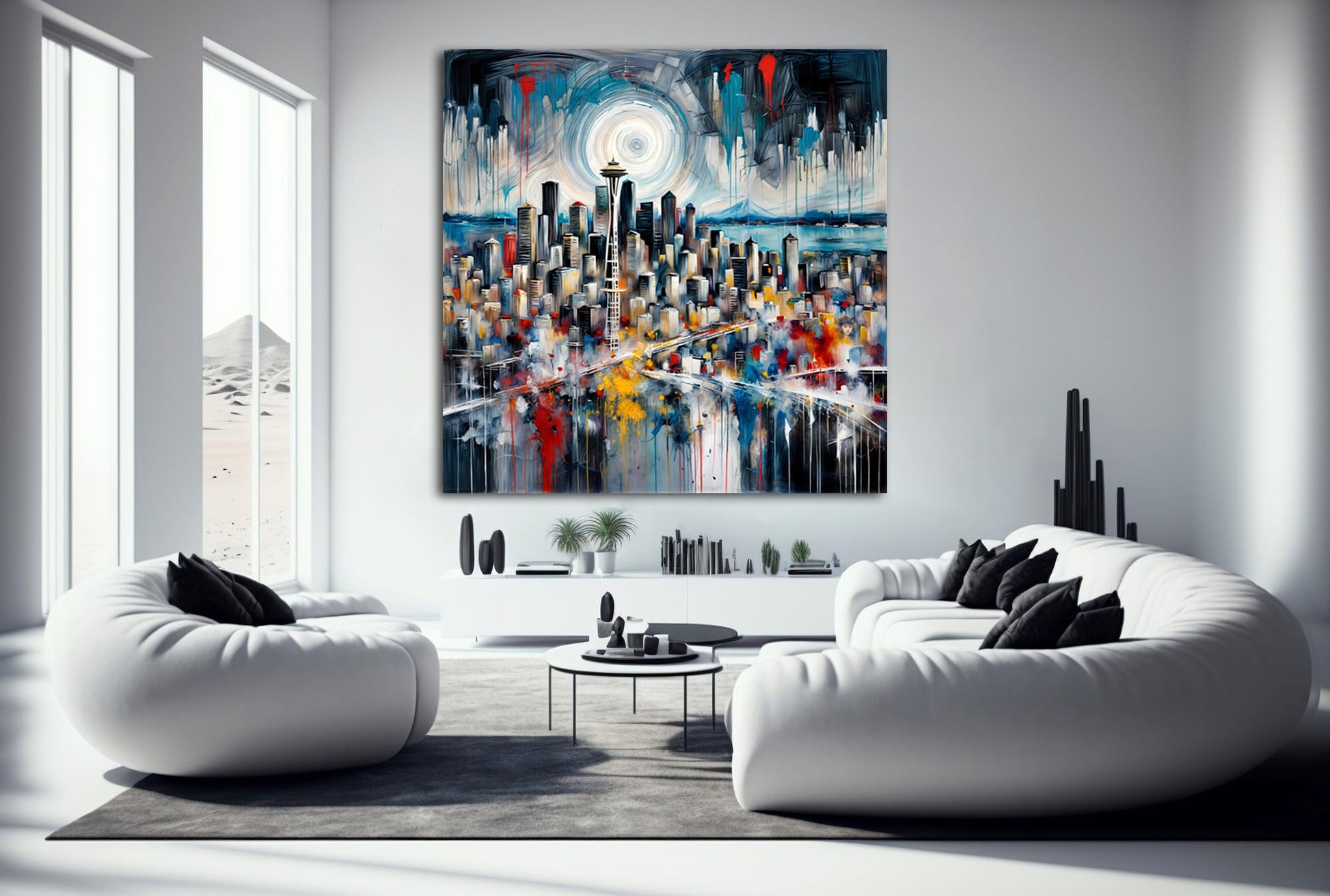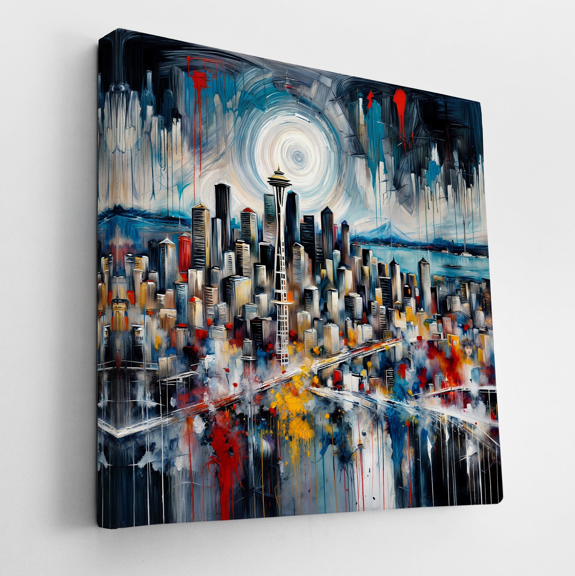 The Skyline Of Seattle a moonlit, atmospheric panorama, is marked by the recognizable silhouette of the Space Needle rising from a bed of vivid strokes and painterly chaos. The composition is layered with energy—dripping reds, electric blues, and smears of yellow create a bustling urban texture beneath swirling skies. The brushwork and dynamic rhythm place this work in the realm of abstracted cityscape painting, drawing on expressionist and contemporary urban impressionist traditions. It captures both the identity and emotional pulse of a modern metropolis. Enhance your décor today and bring this unique artwork into your home or office. This beautiful gallery wrapped canvas is the perfect addition to your favorite home or office space. This Original artwork is available only on Wayfair and comes in a variety of sizes allowing you to find what works best within your home or office. Each piece is printed on museum-grade canvas designed to stand the test of time. Durability, image clarity, and color accuracy are our top priorities, as we use archival inks to prevent fading and to preserve as much fine detail as possible with no over-saturation or color shifting. Our professional staff produce the tightest corners without any bubbles, ripples, or bumps, and include pre-installed hanging hardware for easy installation.
