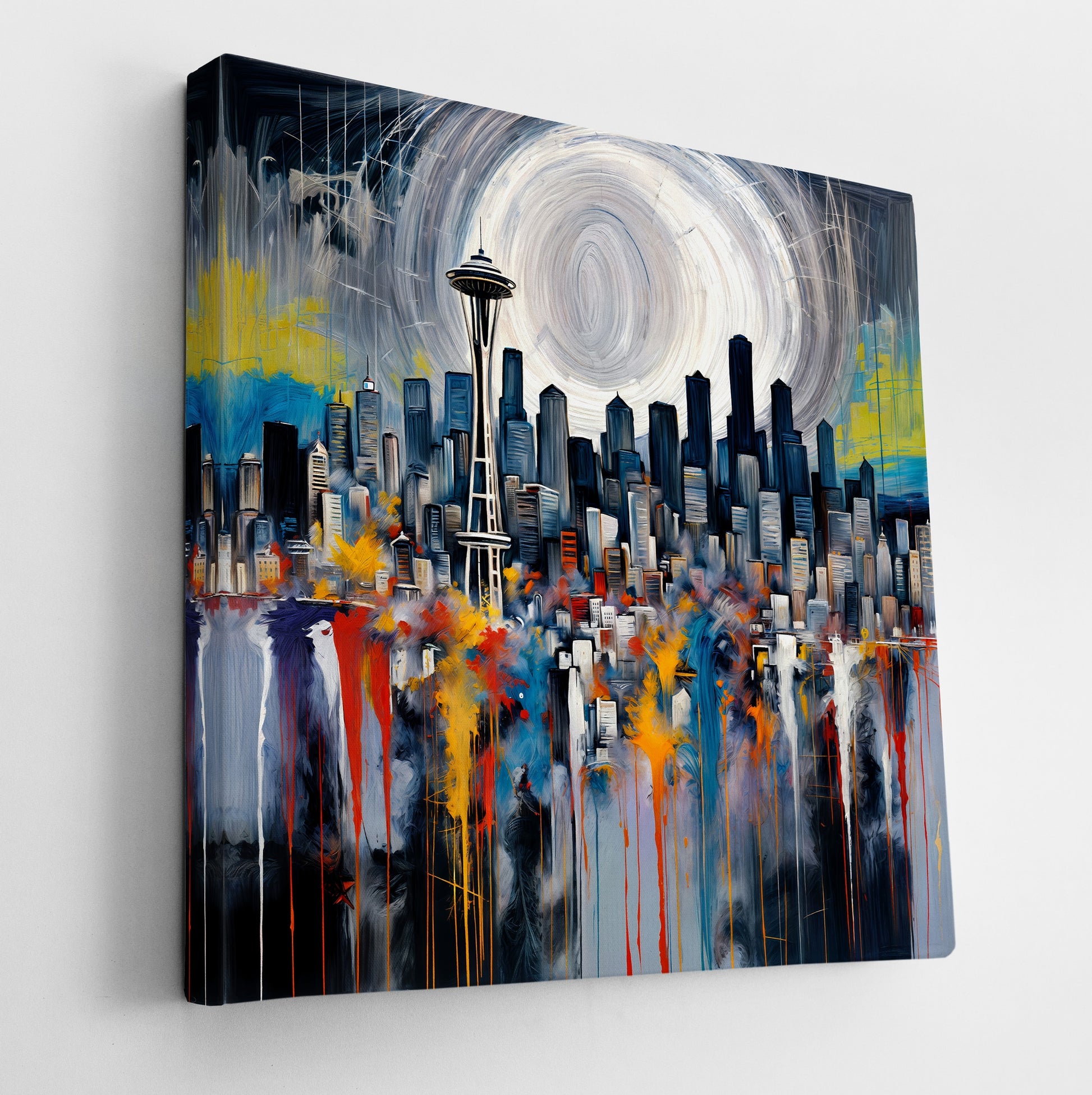 Urban Oasis is a stylized cityscape portraying a dreamy skyline with a prominent full moon and vibrant architectural forms. Towering structures in soft gradients of gray and deep blues are offset by energetic splashes of red, yellow, and white that drip into a reflective, watery base. The presence of the Space Needle again suggests Seattle, yet the surreal atmosphere transforms it into an otherworldly metropolis. The technique—a blend of gestural brushwork and color drips—links the piece to expressive abstraction and modern cityscape genres, with an emphasis on vibrancy and nocturnal rhythm. Enhance your décor today and bring this unique artwork into your home or office. This beautiful gallery wrapped canvas is the perfect addition to your favorite home or office space. This Original artwork is available only on Wayfair and comes in a variety of sizes allowing you to find what works best within your home or office. Each piece is printed on museum-grade canvas designed to stand the test of time. Durability, image clarity, and color accuracy are our top priorities, as we use archival inks to prevent fading and to preserve as much fine detail as possible with no over-saturation or color shifting. Our professional staff produce the tightest corners without any bubbles, ripples, or bumps, and include pre-installed hanging hardware for easy installation.