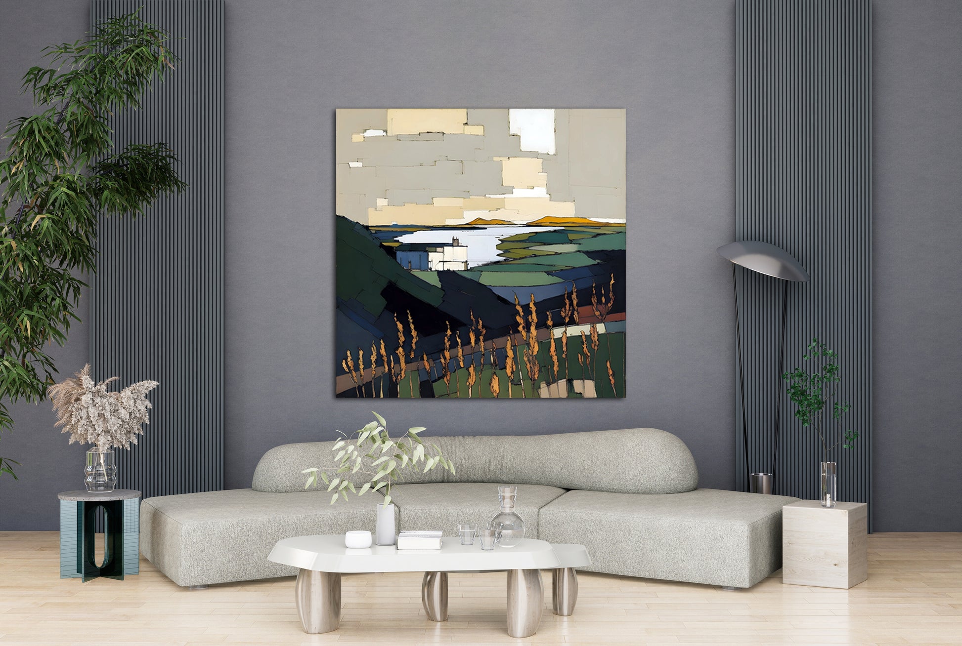 Valley Lake is a stylized landscape using geometric abstraction to reimagine a tranquil lakeside vista. Flat planes of color are blocked into sharp-edged fields of green, ochre, and slate, while the lake acts as a quiet centerpiece beneath a cubist sky. The distant hills and a pair of modest white structures anchor the composition, providing a narrative of human presence amidst rural isolation. The piece blends modernist abstraction with representational elements, making it a hybrid of contemporary landscape and post-cubist stylization. Enhance your décor today and bring this unique artwork into your home or office. This beautiful gallery wrapped canvas is the perfect addition to your favorite home or office space. This Original artwork is available only on Wayfair and comes in a variety of sizes allowing you to find what works best within your home or office. Each piece is printed on museum-grade canvas designed to stand the test of time. Durability, image clarity, and color accuracy are our top priorities, as we use archival inks to prevent fading and to preserve as much fine detail as possible with no over-saturation or color shifting. Our professional staff produce the tightest corners without any bubbles, ripples, or bumps, and include pre-installed hanging hardware for easy installation.