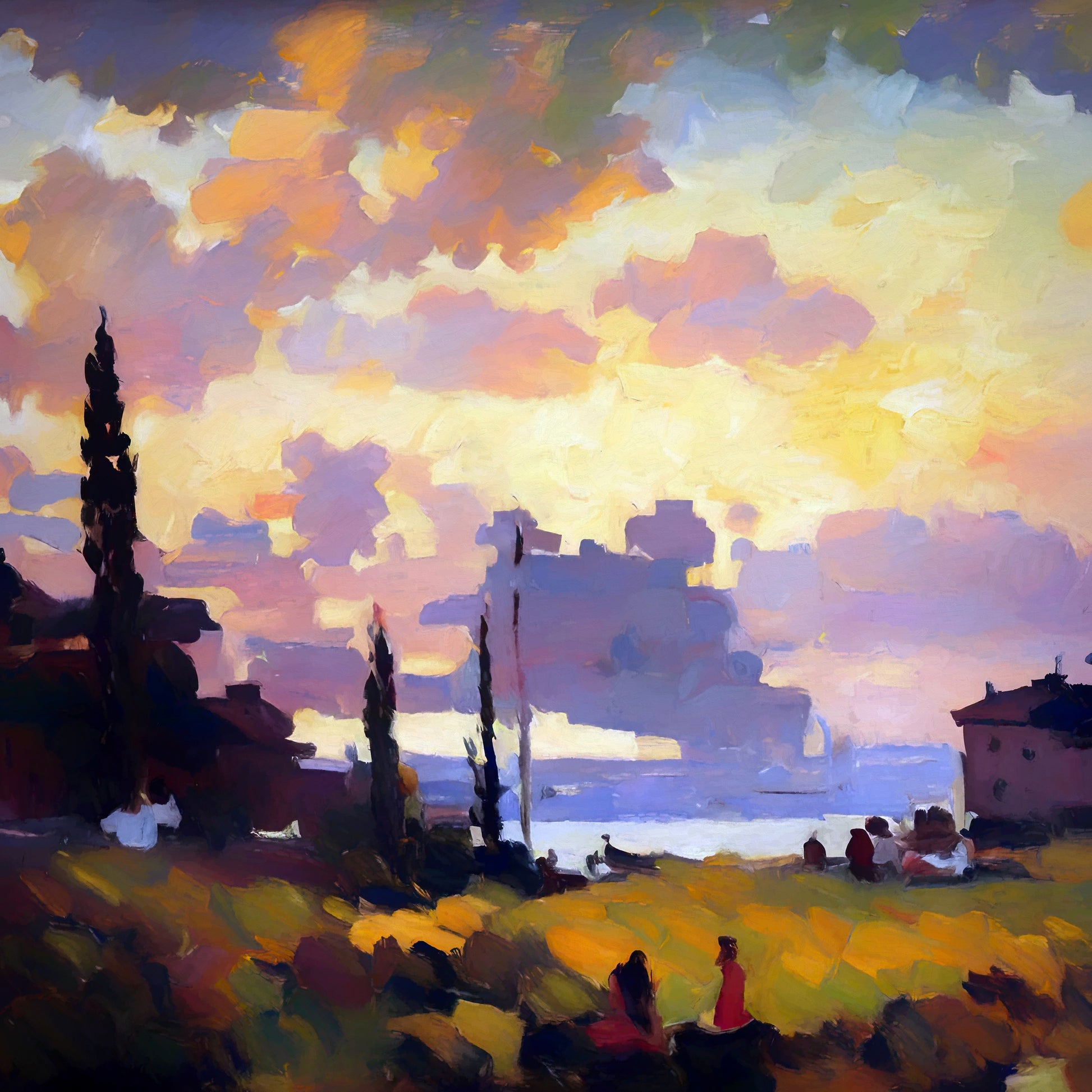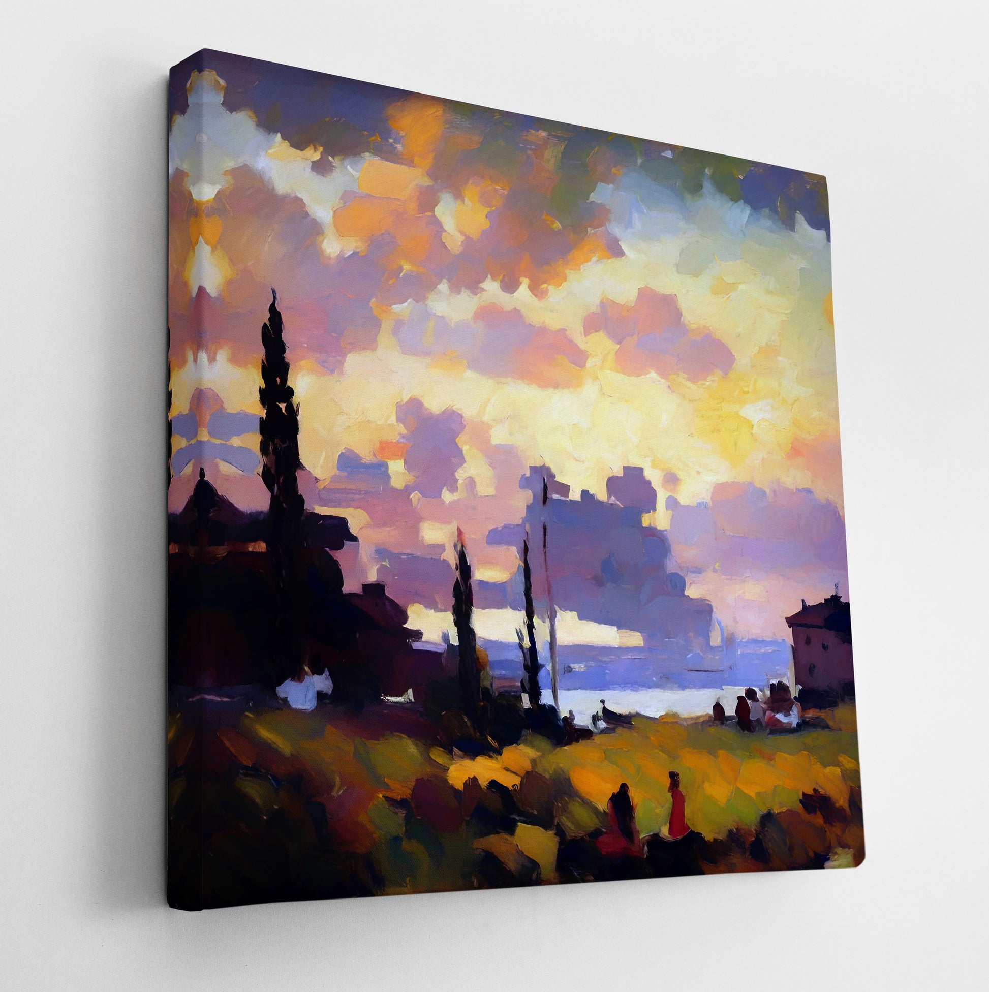 Watching the Sunset, set in a golden field overlooking water, this tranquil piece glows with the warmth of late evening light. Silhouetted figures and cypress trees stretch across the landscape, softened by diffused brushwork. The artist masterfully captures the emotional hush of sunset, with a cloud-filled sky that blends lavender, gold, and apricot tones. Stylistically, it's impressionistic with slight romantic undertones, using light and atmosphere to evoke nostalgia and peace. Enhance your décor today and bring this unique artwork into your home or office. This beautiful gallery wrapped canvas is the perfect addition to your favorite home or office space. This Original artwork is available only on Wayfair and comes in a variety of sizes allowing you to find what works best within your home or office. Each piece is printed on museum-grade canvas designed to stand the test of time. Durability, image clarity, and color accuracy are our top priorities, as we use archival inks to prevent fading and to preserve as much fine detail as possible with no over-saturation or color shifting. Our professional staff produce the tightest corners without any bubbles, ripples, or bumps, and include pre-installed hanging hardware for easy installation.