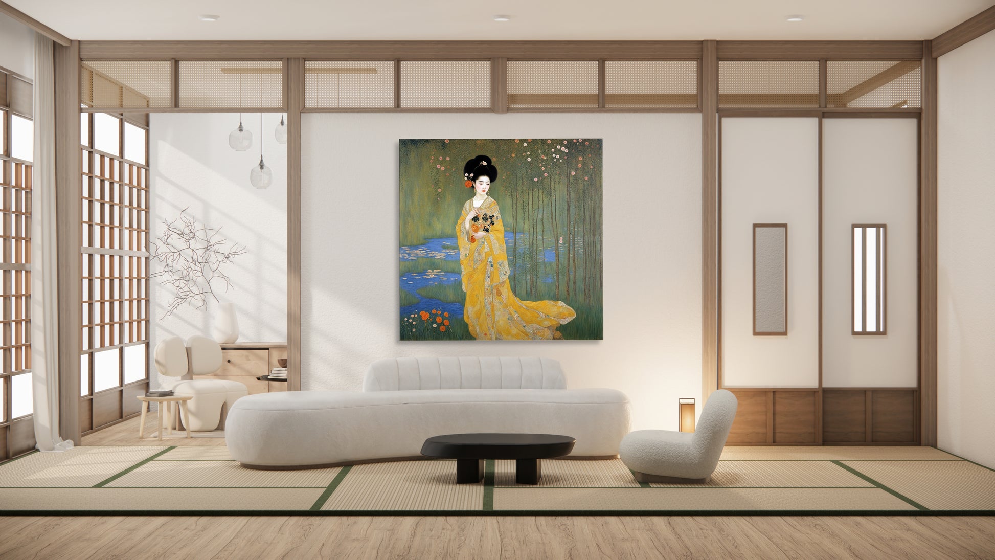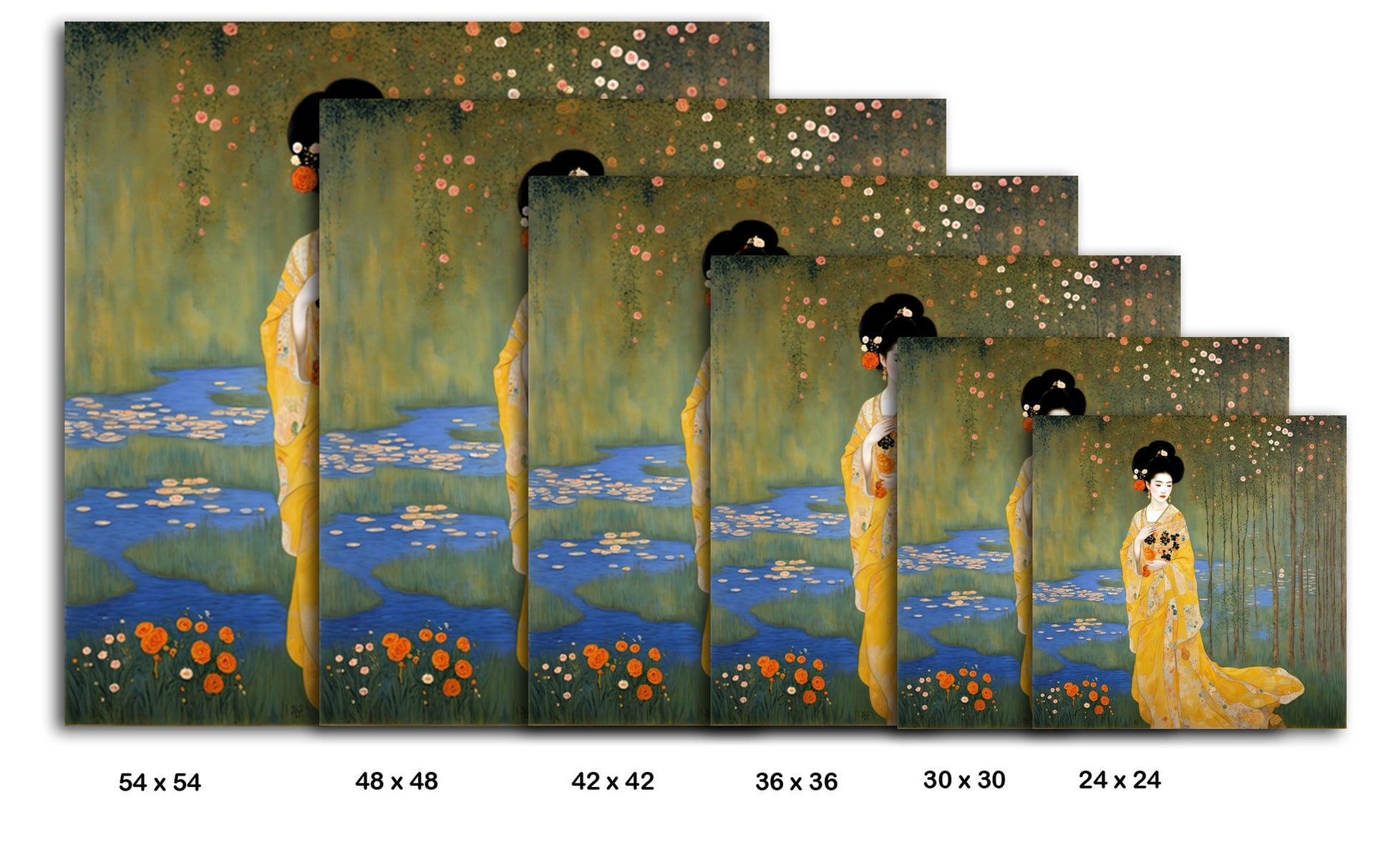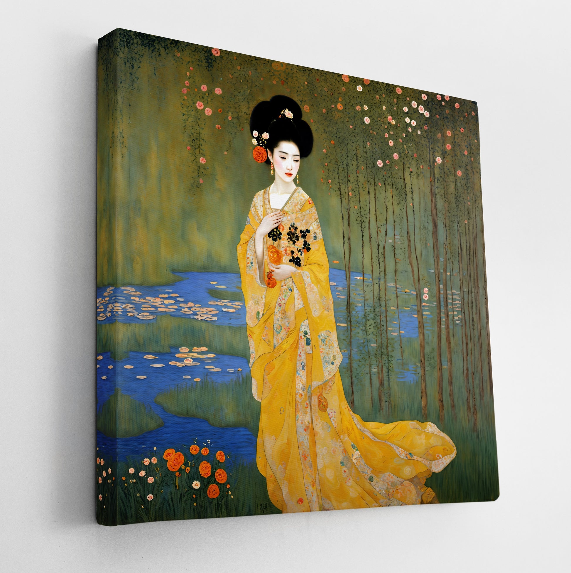 Whispers of the Lotus depicts a graceful woman in a flowing golden robe standing beside a serene pond, surrounded by delicate flowers and tall, slender trees. Her gentle posture and poised expression evoke a timeless elegance, while the stylized flora and dreamlike palette suggest influences from both classical East Asian painting and Art Nouveau. The technique combines fine detail with decorative flatness, creating a piece that is both romantic portrait and poetic nature scene—a harmonious celebration of femininity, tranquility, and natural beauty. Enhance your décor today and bring this unique artwork into your home or office. This beautiful gallery wrapped canvas is the perfect addition to your favorite home or office space. This Original artwork is available only on Wayfair and comes in a variety of sizes allowing you to find what works best within your home or office. Each piece is printed on museum-grade canvas designed to stand the test of time. Durability, image clarity, and color accuracy are our top priorities, as we use archival inks to prevent fading and to preserve as much fine detail as possible with no over-saturation or color shifting. Our professional staff produce the tightest corners without any bubbles, ripples, or bumps, and include pre-installed hanging hardware for easy installation.
